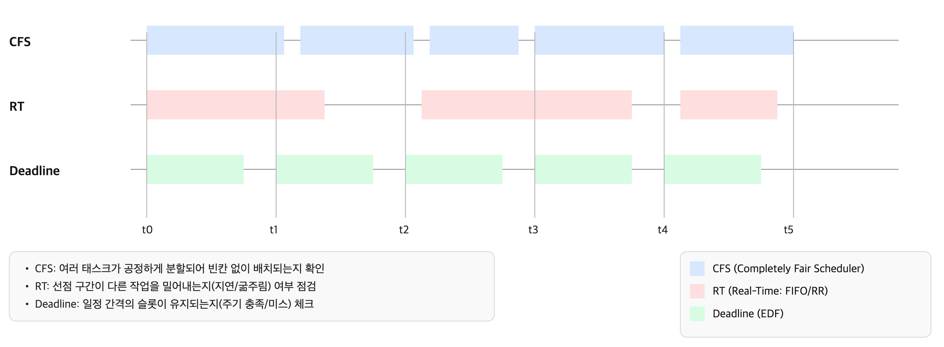 | Deadline | 태스크 마감 시간 보장, EDF(Earliest Deadline First) 기반 | 주기적 실시간 처리, 하드웨어 제어 |