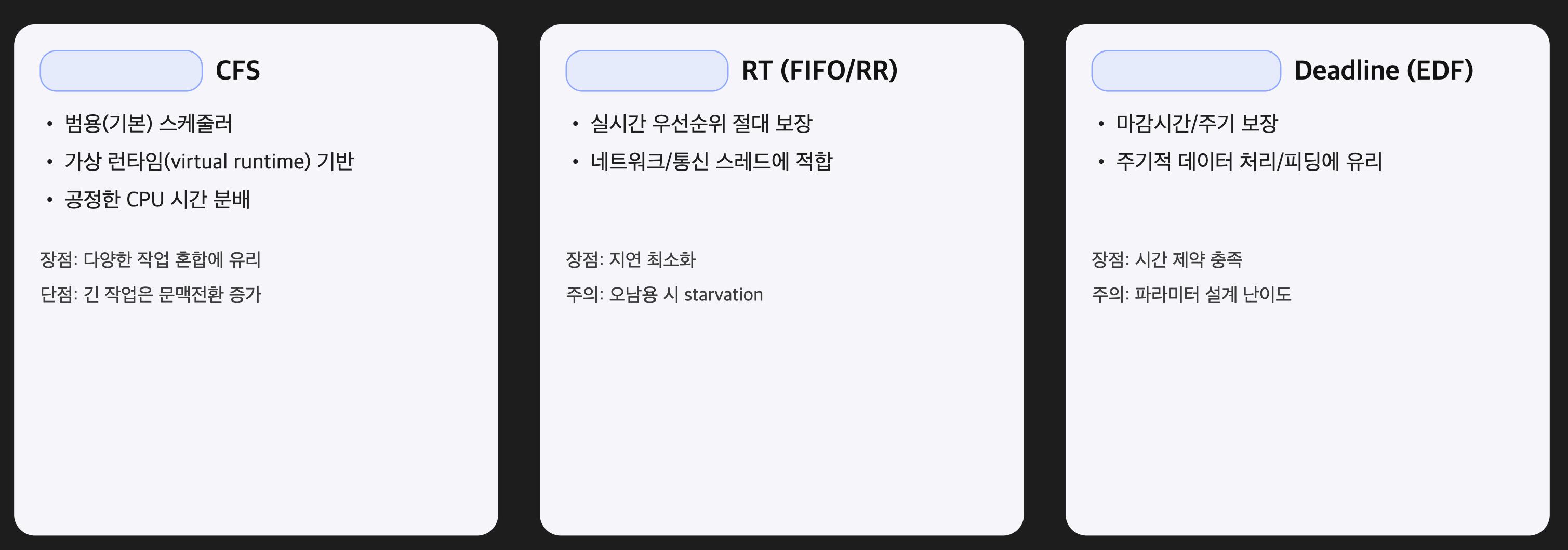 | CFS | 다양한 작업 혼합 가능 | 긴 작업이 자주 중단, 캐시 미스 증가 |