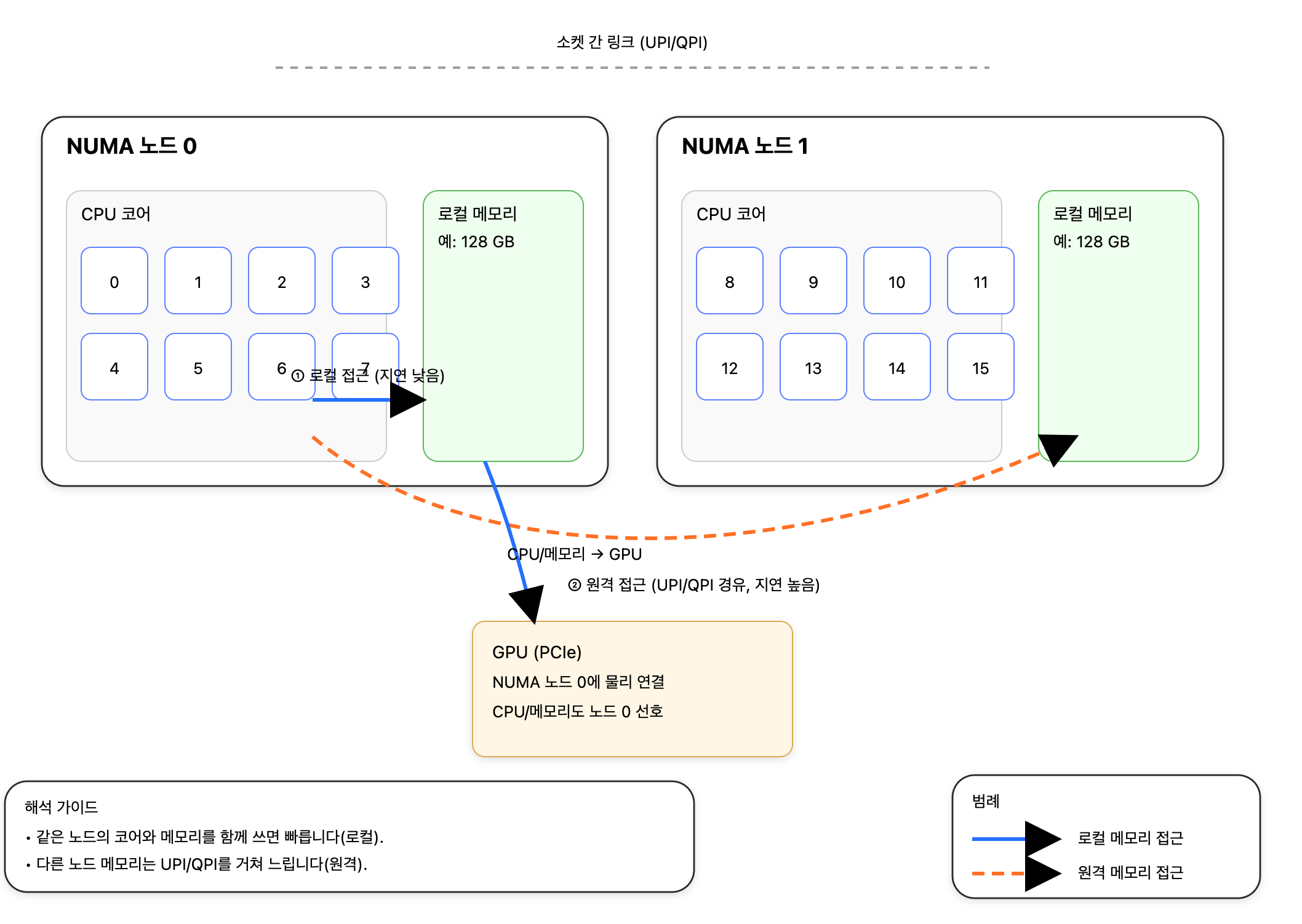 - GPU 연계 시 NUMA 인식: GPU가 PCIe를 통해 특정 NUMA 노드에 물리적으로 연결되어 있는 경우, 해당 노드에서만 CPU–GPU 간 데이터 전송을 처리