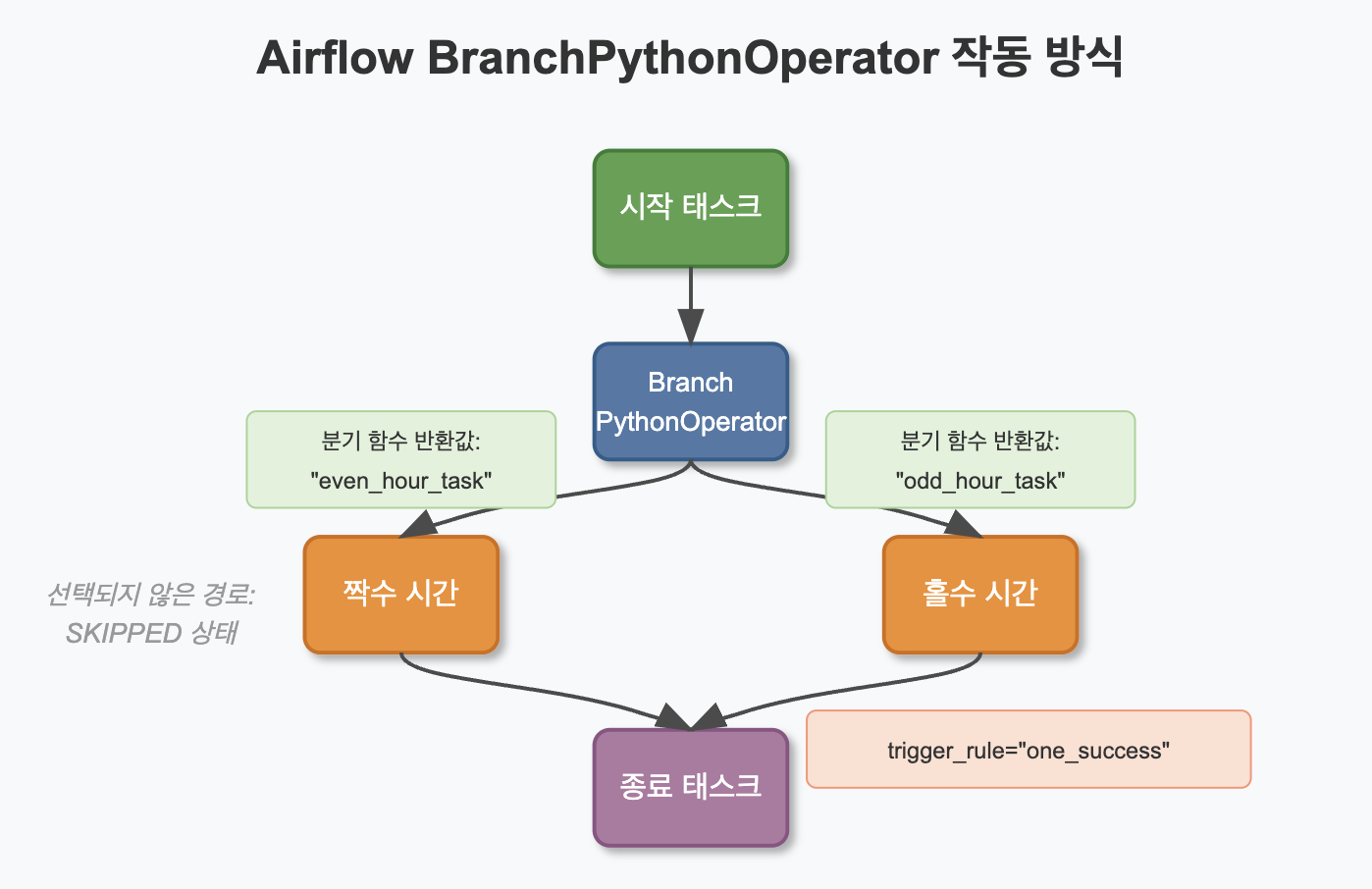 이 글에서는 Airflow DAG 작성의 고급 기법인 Branching, SubDAG, Dynamic DAG에 대해 알아봅니다. 기본적인 DAG 구조를 넘어 더 복잡하고 유연한 워크플로우를 구현하는 방법을 실전 예제와 함께 살펴보겠습니다. 다양한 비즈니스 로직을 Airflow에 효과적으로 구현하기 위한 전략을 배워보세요.📌 Branching 이해하기Airflow에서 Branching은 조건에 따라 다른 경로로 워크플로우를 분기하는 기능입니다. 데이터 처리 파이프라인에서 상황에 맞게 다른 작업을 수행해야 할 때 유용합니다.✅ BranchPythonOperator의 기본 원리BranchPythonOperator는 Python 함수의 반환값에 따라 워크플로우의 다음 경로를 결정합니다. from airflo..