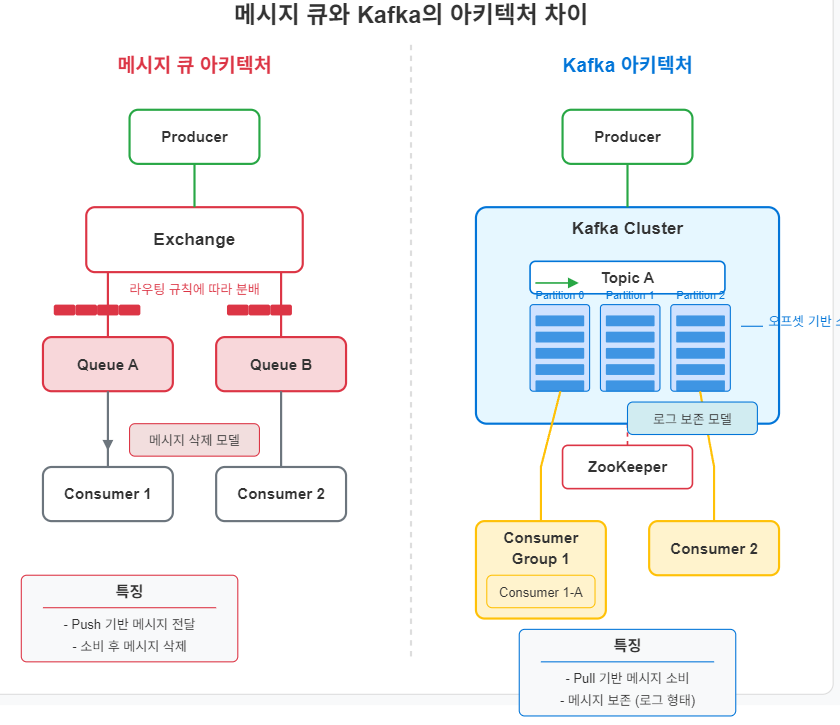 이 글에서는 전통적인 메시지 큐(RabbitMQ, ActiveMQ 등)와 Apache Kafka 간의 핵심적인 차이점을 살펴봅니다. 아키텍처, 성능, 활용 사례, 데이터 처리 방식 등 여러 측면에서 두 시스템을 비교하여 각각 어떤 상황에서 더 적합한지 이해할 수 있도록 도와드립니다.📌 메시지 큐와 Kafka: 개념 비교메시지 큐와 Kafka는 모두 애플리케이션 간 비동기 통신을 지원하는 미들웨어지만, 근본적인 설계 철학과 목적에 차이가 있습니다. ✅ 메시지 큐(Message Queue)란?애플리케이션 간 메시지를 전달하는 중간 저장소 역할주로 작업 부하 분산, 비동기 처리, 시스템 간 결합도 감소를 위해 설계AMQP(Advanced Message Queuing Protocol)와 같은 표준 프로토콜 기..
